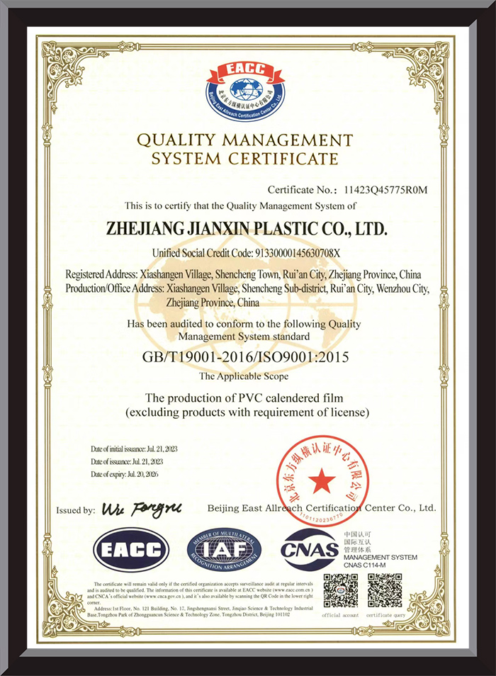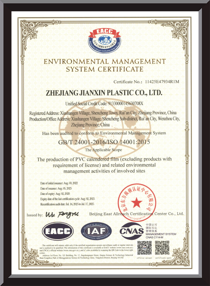 Ранее компания была известна как пластиковая кинофильма Ruian Jianxin, которая была основана в 1992 году. Это частная компания, специализирующаяся на производстве пластиковой пленки из ПВХ. Наша компания специализируется на производстве календерных пленковых продуктов из ПВХ, в основном включающих в себя: европейские и американские стандартные фильмы о защите окружающей среды, прозрачные упаковочные пленки, холодностойкие, высокотемпературные, ультрафиолетовые, антистатические, пламени и т. д.